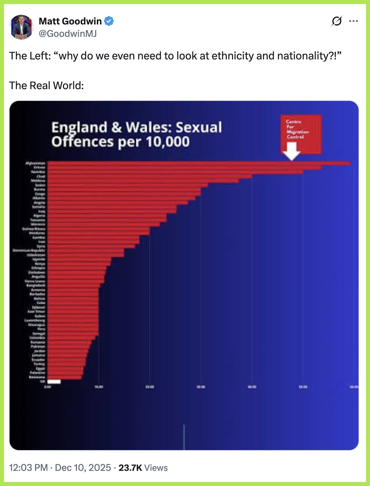 People like Matt Goodwin, all round failed academic and far-right, Reform UK mouthpiece is a prime suspect in this field — in fact, I just looked at 𝕏 and saw the post below [even though he blocked me, I still get force-fed his posts because 𝕏 thinks I need to see them 🙄].