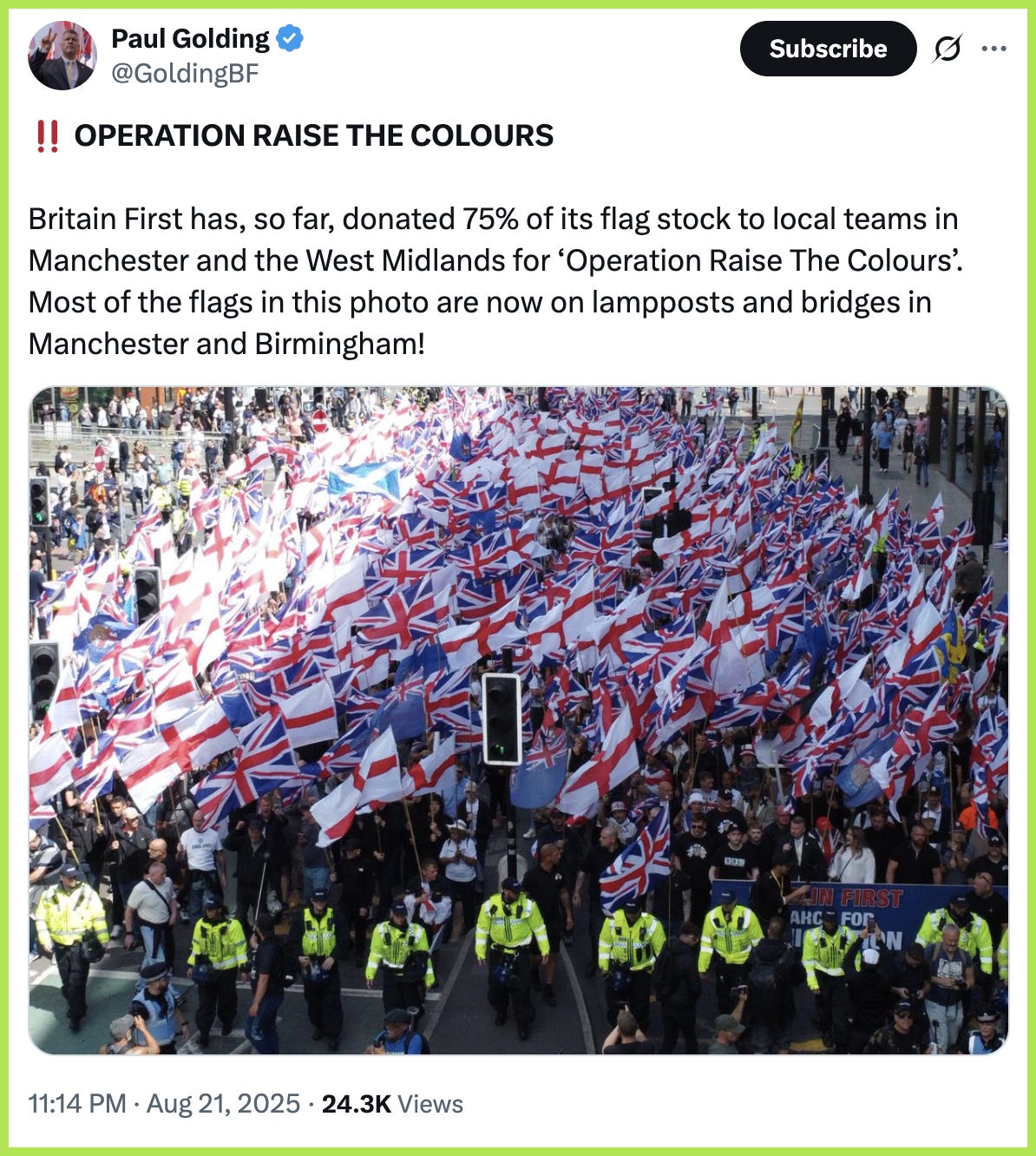 Unfortunately, you’d be misplaced in your assumptions, the flags currently on display have much more sinister connotations. I have written a couple of long posts over on 𝕏 about one particular group that are placing these flags around the West Midlands area. It’s them I’ll mostly concentrate on for this article — Raise the Colours, but there are other groups and individuals that are springing up around the country, using threats of violence and intimidation if anyone challenges them.