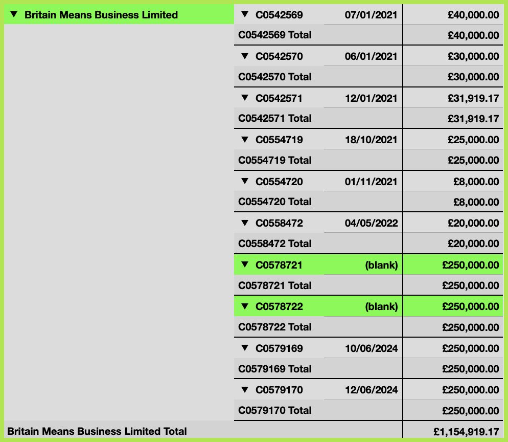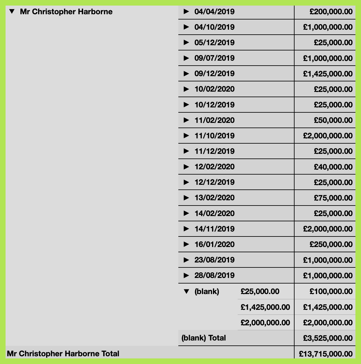 For example, here are the entries that my pivot table extracted for Christopher Harborne — Reform’s largest donor by far. You can read more about Harborne in a previous article:
