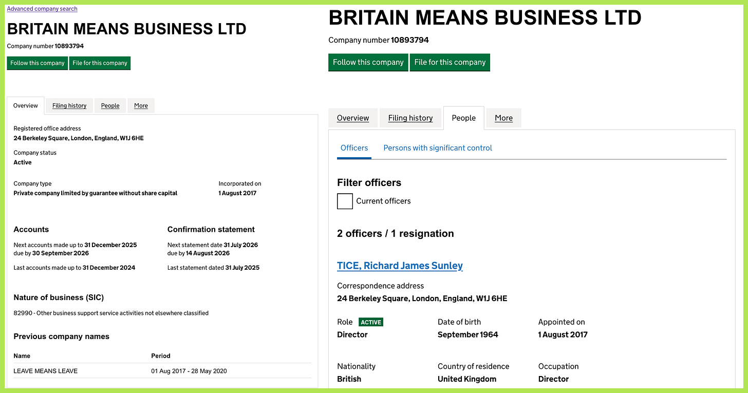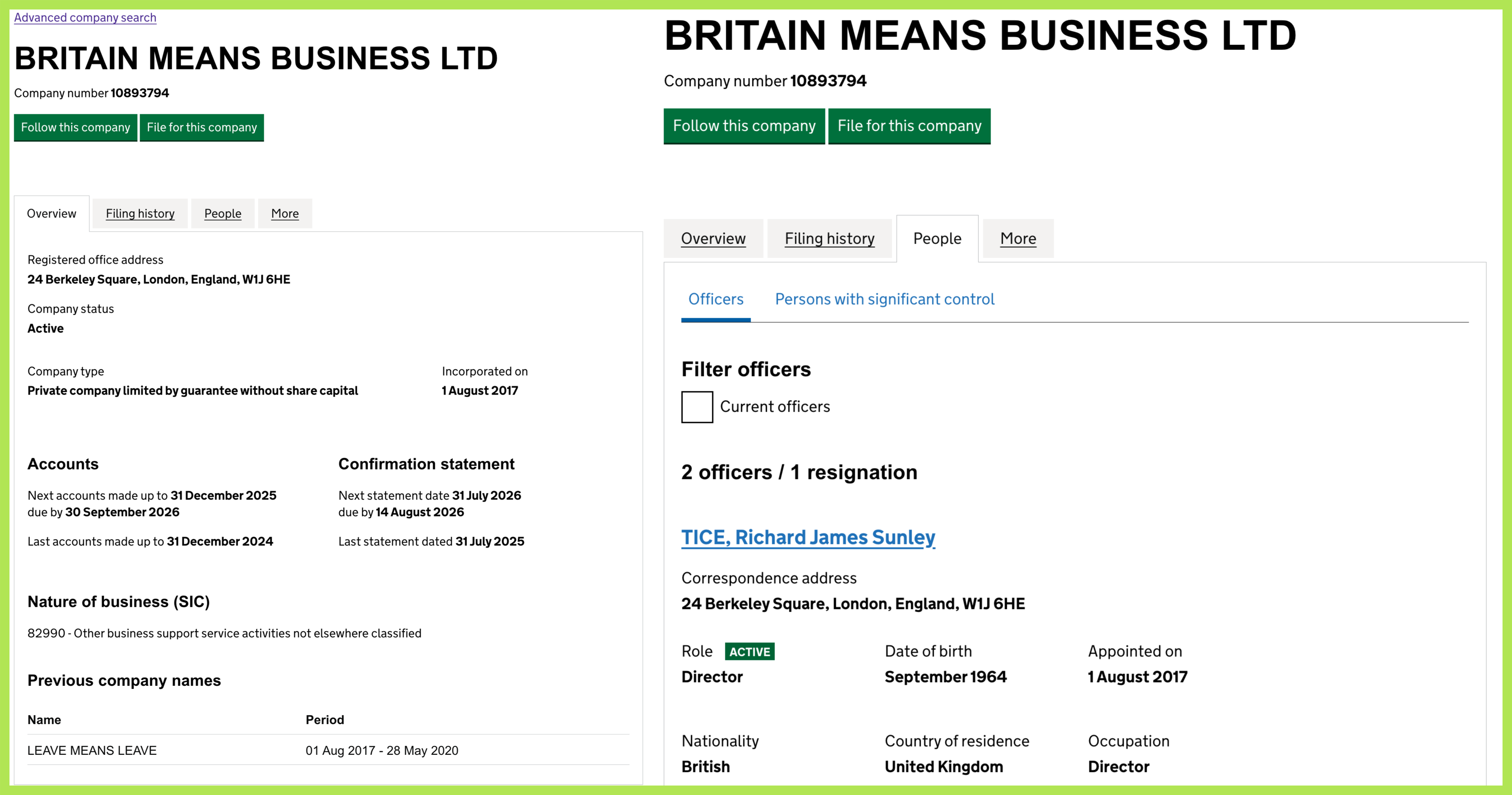 It turns out to be one of many companies belonging to Richard Tice — current director of Reform UK Ltd and, as of last week, new head of DOGE. It’s a miracle that he can fit in time for his actual job as an MP. As you can see from the Companies House snapshots above, the business used to be called Leave Means Leave but then changed its name in 2020 to Britain Means Business and has been busy funnelling cash to Reform ever since. This will not be the last mention of Tice in this article.
