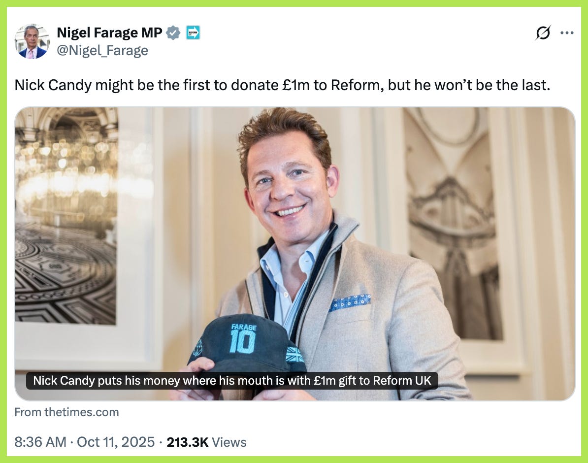 Farage recently announced1 that, ex-husband of Holly Valance, Nick Candy, had donated £1,000,000 to Reform UK — you can insert the Dr Evil.gif in your own heads at this point. At the same time, the Observer’s excellent Whitehall Editor, Cat Neilen wrote a piece about the very first crypto donation to a UK party — understood to be Reform UK.